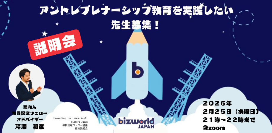 イベント詳細 学校現場でも、アントレプレナーシップマインド(起業家精神)の教育を!教員免許取得者・教育関係者向けワークショップ開催!BizWorld Japan教員認定フェロー講座『Innovation for Education!!』内容について説明会を実施BizWorld Japan教員認定フェロー講座『Innovation for Education!!』とは?BizWorld Japanでは、アントレプレナーシップ教育教材「BizWorld PRO」を使用し、教員認定フェローとして学校現場等における児童・生徒・学生たちにアントレプレナーシップ教育を届ける先生を育成します。未来を生きる子ども達に必要なこと、アントレプレナーシップとは何なのか?なぜ必要なのかを学び、自身もアントレプレナーシップを持って子ども達に「ビジネス基礎」「生きる力」に必要な知識・経験を伝えていきます。私たちBizWorld Japanは、アントレプレナーシップ教育を全ての子ども達に届けるために、教員認定フェローを育成するワークショップ型プログラム「Innovation for Education!!」を開講します。今回は第8期で若干名を募集!3月20日(金・祝)に兵庫県内で研修及び、オンデマンドビデオ教材などでBizWorldを体験し、ファシリテーションを学び、実際に模擬授業実施をするプログラムです。こんな人にオススメ!