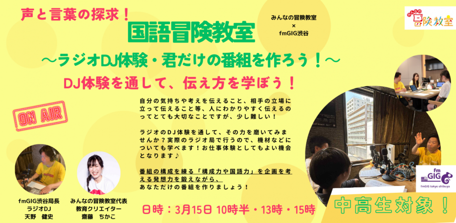 実際のラジオ局で、ラジオ番組を作る体験をしませんか?MC(DJ・パーソナリティ)について学び、話す内容を考えて実際に自分でMC行うことができます♪