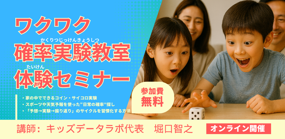 大人向け講義(30分):・家庭で育む“データサイエンス的思考”の基礎・探究力を伸ばす声かけと課題設定の工夫・日常生活での確率教育の取り入れ方