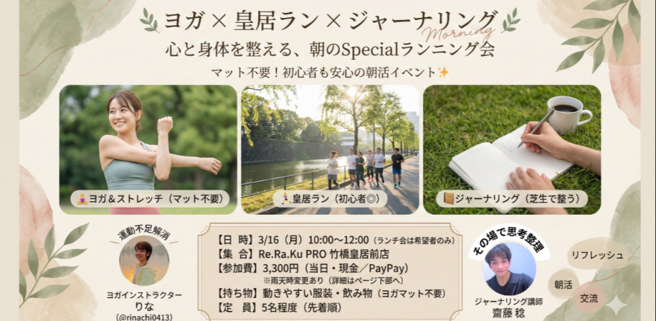 イベント詳細 🌿 ヨガ × 皇居ラン × ジャーナリング 🌿心と身体を整える、朝のSpecialランニング会