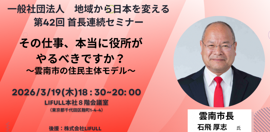 日 時 : 2026年03月19日(木)18:30~20:00(18:15受付開始)場 所 :LIFULL本社8階会議室 (〒102-0083 東京都千代田区麹町1丁目4−4)講 師 :石飛 厚志 雲南市長