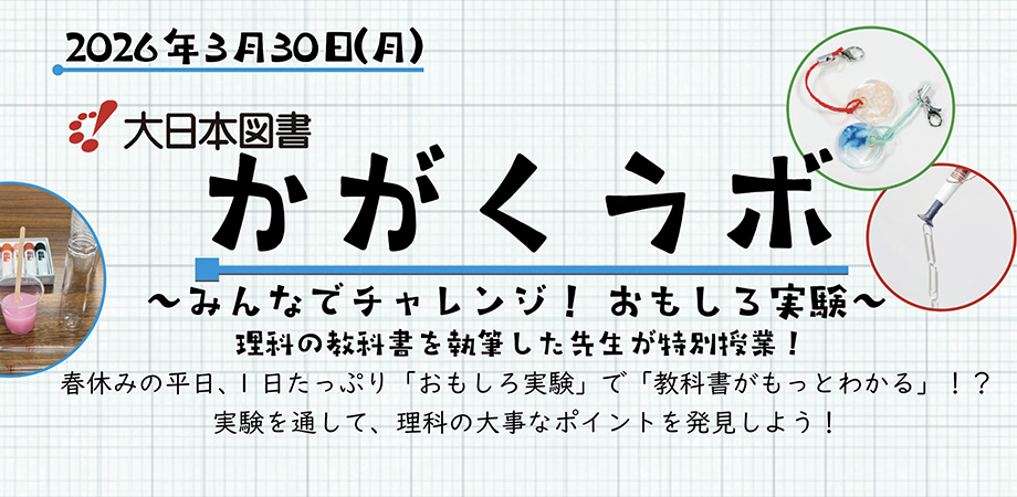 イベント詳細 〇概要〇講座名:「かがくラボ ~みんなでチャレンジ! おもしろ実験~」大日本図書の理科の教科書を執筆した先生が小学校3年生・4年生に向けて、特別授業を開催します!教科書にはない「おもしろ実験」で「教科書がもっとわかる」かも!?実験を通して、理科の大事なポイントを発見しよう!