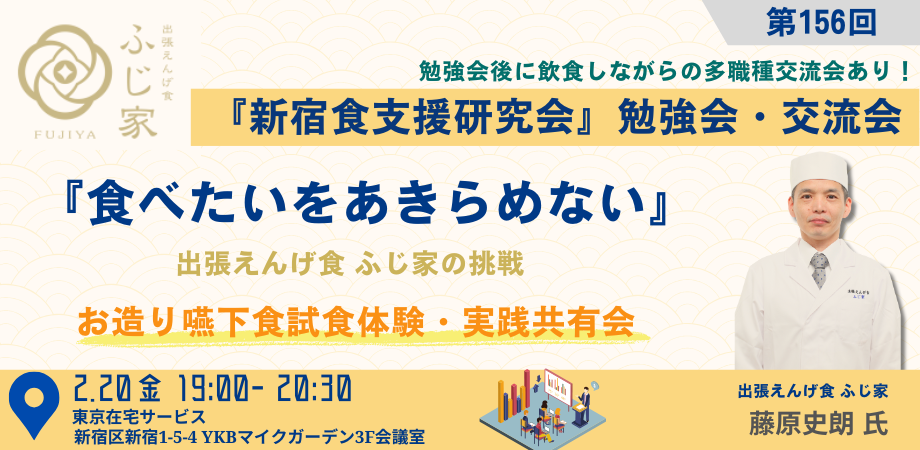 <概要>高齢化社会が進む中で、嚥下食の必要性や役割は、ますます高まっています。出張えんげ食「ふじ家」を始めたきっかけや、料理人が作る嚥下食は何が違うのかについて、お話しします。