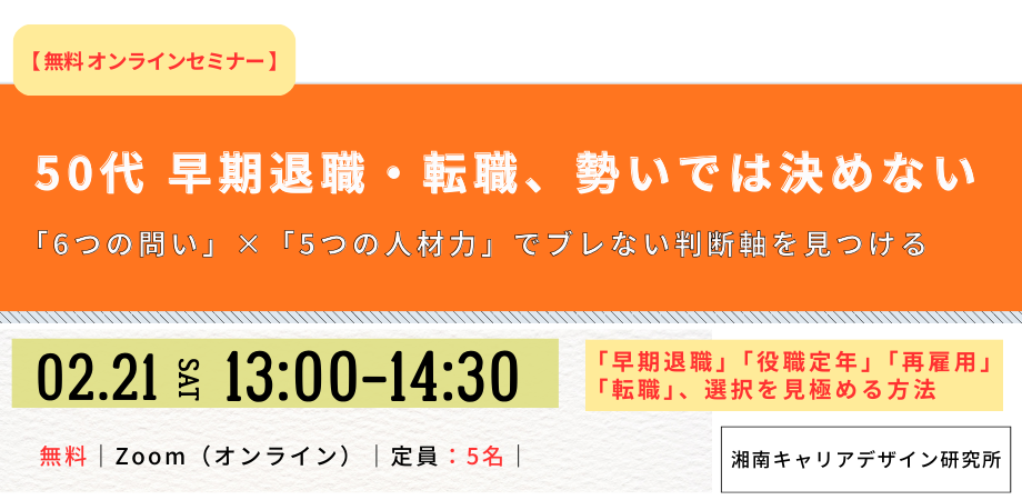 早期退職・役職定年・再雇用・転職で迷う50代の方へ!「6つの問い×5つの人材力」で“ぶれない判断軸”を90分で作ります。50代で早期退職や転職を... powered by Peatix : More than a ticket.