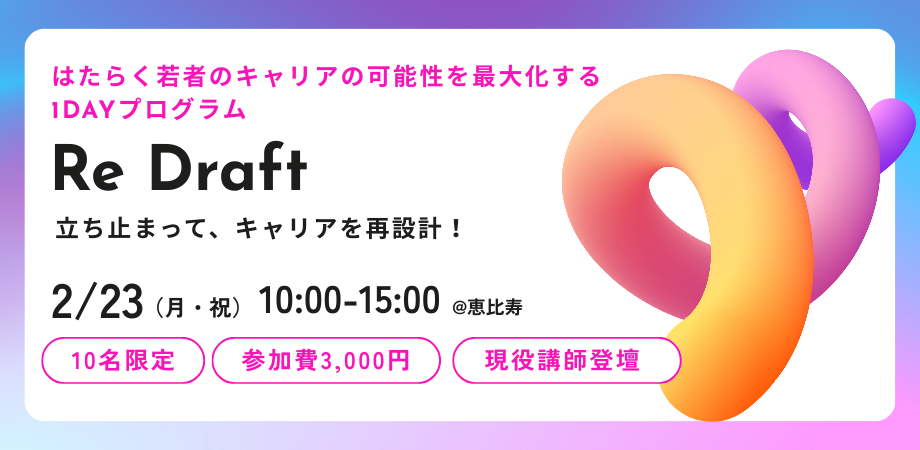 「可能性の使い道」を再設計(Draft)する場所。Re Draftは、今の仕事に「不満」があるわけではないけれど、自分の力をもっと活かせる場所があるはずだと感じているはたらく若者のための、1Dayキャリア再設計プログラムです。