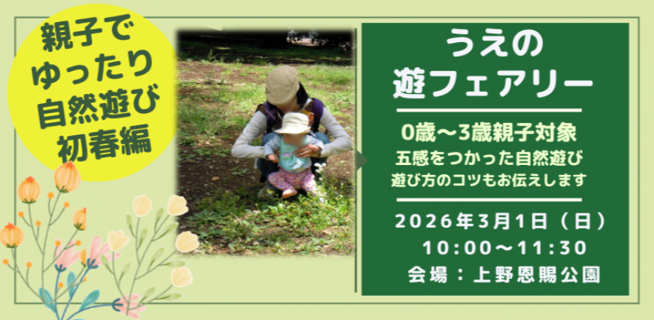 ●【対象】0-3歳親子 先着10組●【場所】上野恩賜公園 国立科学博物館前または東京都美術館横あたりの森 フィールド状況によって集合・活動場所は変わりますので、1週間前ほどにお送りする参加要項をご確認ください。●【参加費】1500円 3名様MAX/1家族(兄弟等追加の場合は500円/1名)プログラム代・教材・テキストなど込●【申込締切】 2026年2月27日(金)12:00まで●【キャンセル料】2月27日(金)12:00まで無料 以降は参加費100%※荒天、主催者都合によるキャンセルの場合は、キャンセル料は発生いたしません。(クレジットカード以外でお支払いの場合は、システム利用料が発生するため、差し引いた金額で返金とさせていただきます。)【その他】・遊フェアリーでは親子の時間を大切にしています。保護者の方にも一緒に活動に参加楽しんでください。保護者の方も動きやすく汚れても良い服装でお越しください。・開催日1週間前頃に開催要項をメールでお送りします。届かない場合は、必ず遊心までお問い合わせください。・HPより安全対策についてを必ずご確認ください。