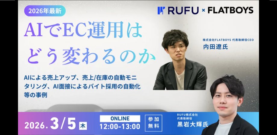 本セミナーでは、EC運用の自動化を支援するRUFU株式会社と、AIアバターでアルバイト採用を自動化する「AIバイト面接 」を提供する株式会社FLATBOYSの2社により、AI活用によるECモール運用の展望を議論します。