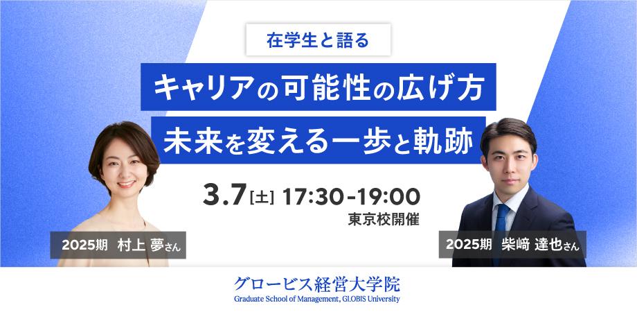【概要】■ 日 時:3月7日(土)17:30~19:00(受付開始 17:10~)■ 場 所:グロービス経営大学院 東京校■ 参加費:無料■定 員:30名【対象】35歳以下の社会人経験をお持ちの方