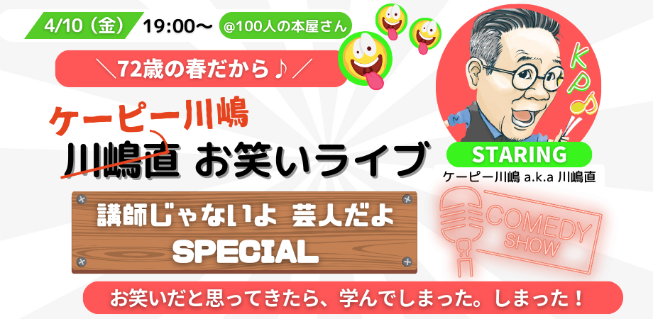 「お笑いだと思って来たら、学んでしまった。しまった!」 2年前の笑撃を再び。 KP法でお馴染みの川嶋直。お笑いKP芸人「ケーピー川嶋」として発進したのは2年前の春、世田谷松陰神社前... powered by Peatix : More than a ticket.