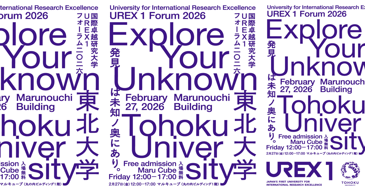 東北大学国際卓越研究大学UREX1フォーラム2026ExploreYourUnknown誰も見たことのない世界に手を伸ばし、言葉にもならない問いに向き合う―研究第一を掲げる東北大学は、100年以上にわたり、知への探求を積み重ねてきました。昨年には国際卓越研究大学第一号に認定され、世界にひらかれた研究拠点としてさらなる挑戦を始めています。「発見は未知ノ奥にあり」。知を探究することは、未来を信じること