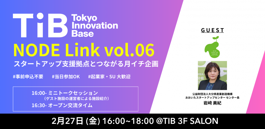 ★先着30名様 大分の特産品をプレゼント!★ NODE Link vol.06〜全国のスタートアップ支援拠点とつながる〜 TIBは多様なプレイヤーを結び付ける"結節点"の取組の一つ... powered by Peatix : More than a ticket.