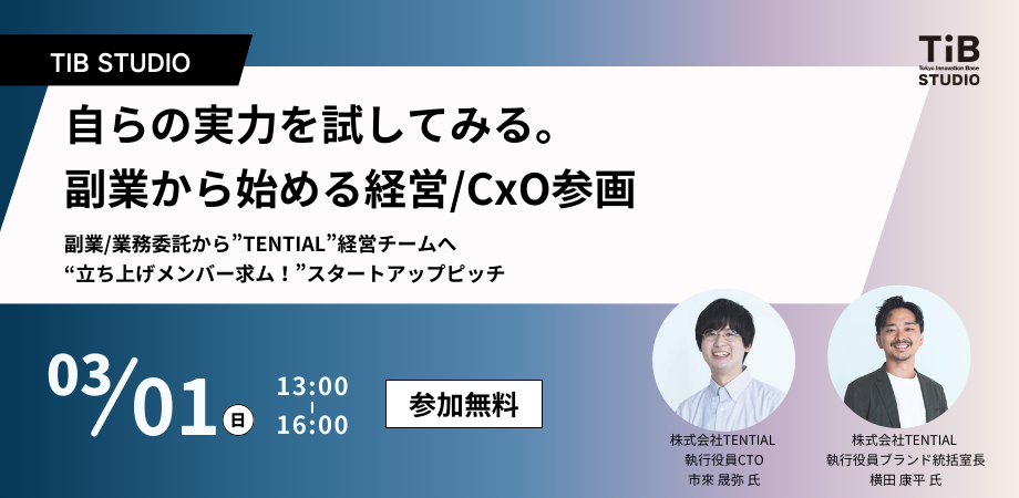 自らの実力を試してみる。副業から始める経営/CxO参画副業/業務委託から”TENTIAL”経営チームへ“立ち上げメンバー求ム!”スタートアップピッチ3.1(日) 13:00-16:00 東京・有楽町