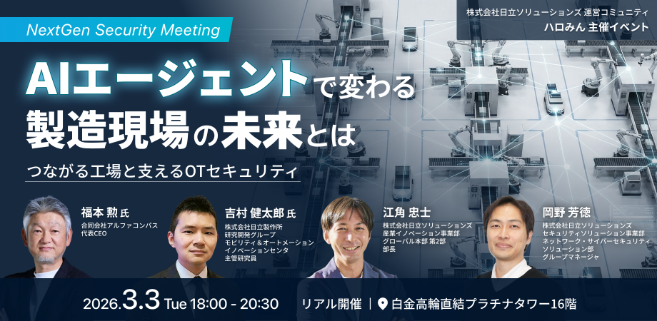 【名称】NextGen Security Meeting AIエージェントで変わる製造現場の未来とは~つながる工場と支えるOTセキュリティ~【日時】2026年3月3日(火) 18:00~20:30(17:30か...