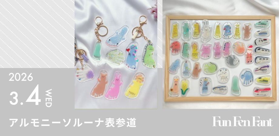 ※写真はイメージです【スケジュール】3/4開催①10:10②10:20③10:30④10:50⑤11:00⑥11:10⑦11:30⑧11:40⑨11:50⑩12:50⑪13:00⑫13:10⑬13:30⑭13:40⑮13:50⑯14:10⑰14:20⑱14:30⑲14:50⑳15:00 ▶定員:各回1名様▶参加費(税込):早割 2,800円/当日 3,000円(送料込み)※お一人で複数制作される場合は2枠続けてご予約ください※早割は前々日の23:59までのご購入が対象となります。▶所要時間:30分▶持ち物:抱っこ紐をご持参いただくと制作がスムーズです。 ベビーカーでのご来場可。▶注意事項・細心の注意はしていますが、万が一インクが付いてしまっても大丈夫な服装でお越しください。・ご予約時間ギリギリでのご入場ですとご入場に時間がかかる場合がございます。余裕を持ってのご入場がおすすめです。・予約時間が過ぎてお越しになりますと、制作時間が短くなる可能性や制作できるモチーフが限られる場合がございます。あらかじめご了承くださいませ。・複数個ご希望の方は連続する時間を複数個ご予約ください。・プラ板キーホルダーは後日郵送となりますのでご了承くださいませ。・2~3週間後のお届けとなります。▶講師:手形アート&handmade tsubomi【イベント概要】▶FunFenFant公式サイト公式サイトから来場予約いただいたお客様にプレゼントがございます。