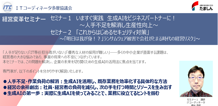■プログラム【第1部】セミナー 13:00~14:50 セミナー1 「生成AIをビジネスパートナーに」 13:00~14:30 ITコーディネータ多摩協議会の専門家が具体的な事例を交えて解説いたします。 貴社の成長に繋がるヒントを得られる貴重な時間です。ぜひご参加ください。 セミナー1では、実際にChatGPTを使ったワークショップを行います。 スマートフォンの持参をお願いします。 ※セミナー会場に、WiFi環境はございません。 セミナー2 「これからはじめるセキュリティ対策」 14:30~14:50 ~「明日は我が身!?」ランサムウェア被害で会社が止まる時代の経営リスク~ NTTドコモビジネスソリューションズ株式会社【第2部】よろず相談会 15:00~16:00(希望者のみ)経営やITに関するお悩み・疑問点を、専門家が直接お伺いし、アドバ...