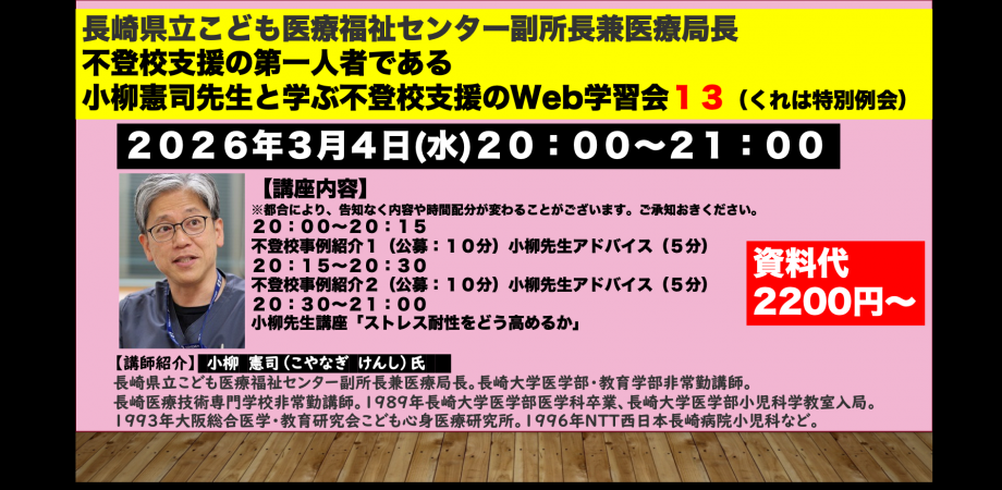 イベント詳細 チケットを入手してイベントに参加しよう!【不登校支援の第一人者】小柳憲司先生と学ぶ不登校支援のWeb学習会2026年3月4日(水)20:00〜21:00 https://koyanagi0304.peatix.com・・・・・・・・・・・・・・・・・・・・・・・・・・・・・・様々なタイプの不登校児童を支援してきた小柳医師から不登校で困っている児童・保護者をどういった機関に繋いでいくかのヒントをいただける時間になります。私たちにとっても、大変興味深く、大変困っているところだと思います。興味がある方は、是非、ご参加ください。医学的検知からの不登校支援の第一人者である長崎県立こども医療福祉センター副所長兼医療局長の小柳憲司先生https://www.pref.nagasaki.jp/bunrui/hukushi-hoken/iryo/bumon/shinryou/とのZOOMを使った学習会の案内です。・・・・・・・・・・・・・・・・・・・・・・・・・【日時】2026年3月4日(水)20:00〜21:00【会場】オンライン(zoom)【講座内容】状況により、講座内容が変わる場合があります。19:45~20:00 Zoom受付・・・・・・・・・・・・・・・・・・・・・・・・・・・・・・