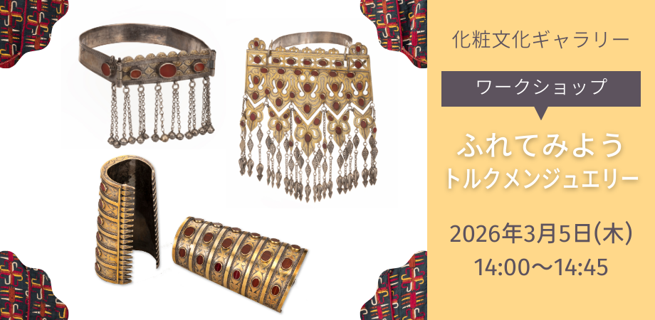 イベント詳細 化粧文化ギャラリー「Turkmen Jewelry-祈りの造形」展関連プログラムトルクメン(現トルクメニスタン)は中央アジアの南西部に位置する国で、西端をカスピ海に接し、シルクロード交易の要所として栄えた歴史を持ちます。砂漠に生きる遊牧の民であったトルクメンの人々は、風土や生活様式に根差した独自の装身文化を築いてきました。トルクメンの装身具は、カーネリアン(紅玉髄)と銀の華やかな組み合わせや、重厚な趣が特徴です。中でもひときわ華やかで迫力があるのが首飾りです。馬蹄型の首輪部分に装飾版を吊り下げる構造で、重いものでは600gを超えるものもあります。また腕輪は、時代が進むにつれて大型化の傾向がみられ、長さが15cmに及ぶものも登場しました。本プログラムでは、ポーラ文化研究所が所蔵するトルクメンの装身具を実際にお手に取ってご覧いただけます。ずっしりとした重量感や、悪霊を払うと考えられた鈴の下げ飾りが揺れる音など、ぜひ間近で見て、聞いて、感じてみて下さい。*資料にふれる際は、手袋(ニトリル製)をご使用いただきます。*「Turkmen Jewelry-祈りの造形」展の詳細についてはこちら*ポーラ文化研究所ウェブサイト「デジタルミュージアム」で公開中【トルクメンの装身具】もぜひご覧下さい。