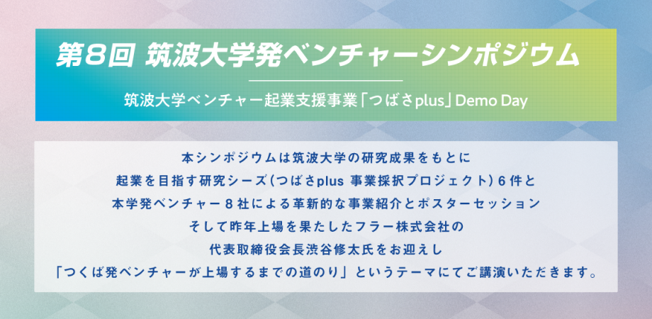 第8回筑波大学発ベンチャーシンポジウムは、研究成果をもとに起業を目指す6チームの研究シーズの紹介、そして筑波大発ベンチャー8社の事業紹介、ポスターセッションを行います。 また、基調... powered by Peatix : More than a ticket.