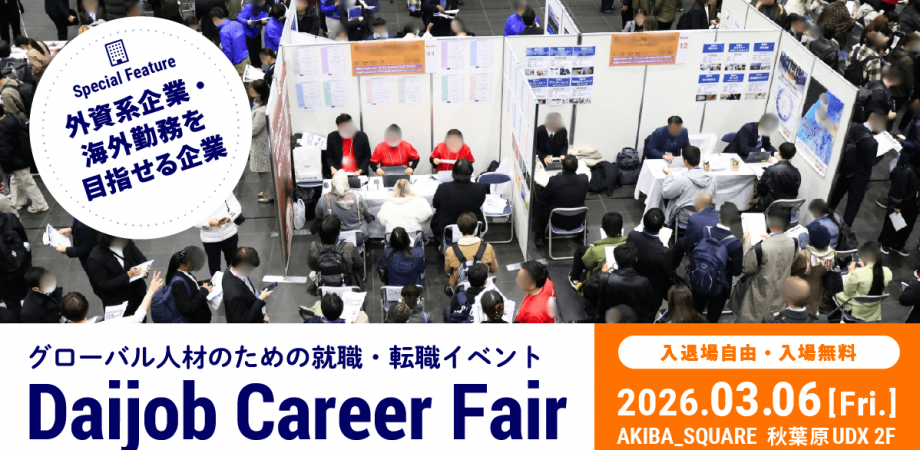 イベント詳細 -Scroll down for English-「Daijob Career Fair」は、語学力や留学経験、スキルを活かしてグローバルに働きたい求職者の皆さまと外資・グローバル企業をつなぐ合同企業説明会!🌟語学力・留学経験を活かして活躍したい🌟外資・グローバル企業へ転職したい🌟自身のキャリアについてもっと考えたいそんな方にぴったりのイベントです。バイリンガル・グローバル人材の転職・就職に強い"Daijob.com"だから実現できる、魅力たっぷりの転職フェアでは、出展企業の採用担当者と直接話せるだけでなく、外資・グローバル企業への転職を目指す方のためにキャリア形成やグローバル転職に役立つセミナーも無料で開催!イベント詳細や参加登録はこちらからご確認ください。【開催概要】■日時2026年3月6日(金)16時30分 - 20時30分(最終入場 20時00分)■会場AKIBA_SQUARE 秋葉原UDX 2F■参加対象者グローバルに活躍したい、全ての求職者(転職・新卒)※参加無料・入退場自由!※参加には事前登録が必要です(無料)。参加登録はこちらからーーーーーーー🌟Whether you are currently living in Japan, looking for new challenges, or just visiting but considering a career here, take the first step and visit the Daijob Career Fair!🌟Our 59th Daijob Career Fair in Tokyo will be held on March 6th!This is a great opportunity for those thinking about working in a multicultural company or building a career in Japan!Visit our special site to pre-register now!Event Overview59th Daijob Career Fair[Date/Time]Mar. 6, 2026 [Fri.] 16:30 - 20:30 (Final Entry 20:00)[V...