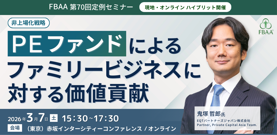 欧米では、資産家のファミリーが富の長期的保全と成長、そして事業家としてのDNAを残し・広めたいという意識に基づきPEファンドを立ち上げる例があります。それらファンドは、所謂金融出自のPEファンドに比べて短期的なエグジットよりも投資先企業の長期成長、存在意義や哲学を重視する傾向があります。日本で進むファミリー事業のオーナーシップ売却の増加は事業承継の多様化として前向きに捉えられるべきですし、PEファンドは戦略策定力や外部ネットワークを提供することで企業の永続性とファミリーの資産多様化に貢献できます。貴会のようなファミリーアドバイザーの観点では、売却後の関与のあり方やファミリーの価値観が尊重されるかを慎重に見極める支援が重要だと考えます。本セミナーでは、ベネッセやフジテックの例を踏まえ、ファミリー出自のPEファンドである当社EQTが創業家と共に如何に案件を組成したか、その後どのような価値貢献に取り組んできたかをお話しできればと考えております。
