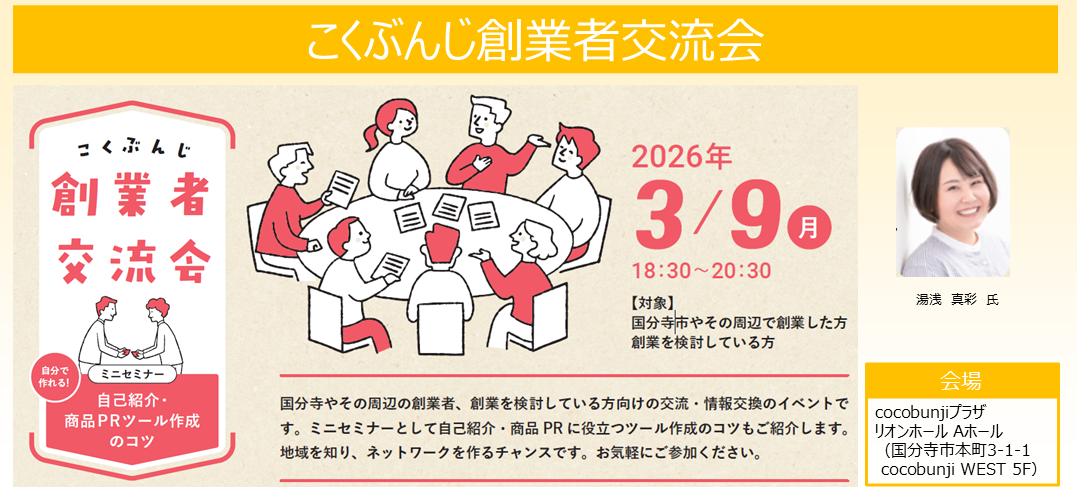 【国分寺市】こくぶんじ創業者交流会 ミニセミナー「自分で作れる!自己紹介・商品PRツール作成のコツ