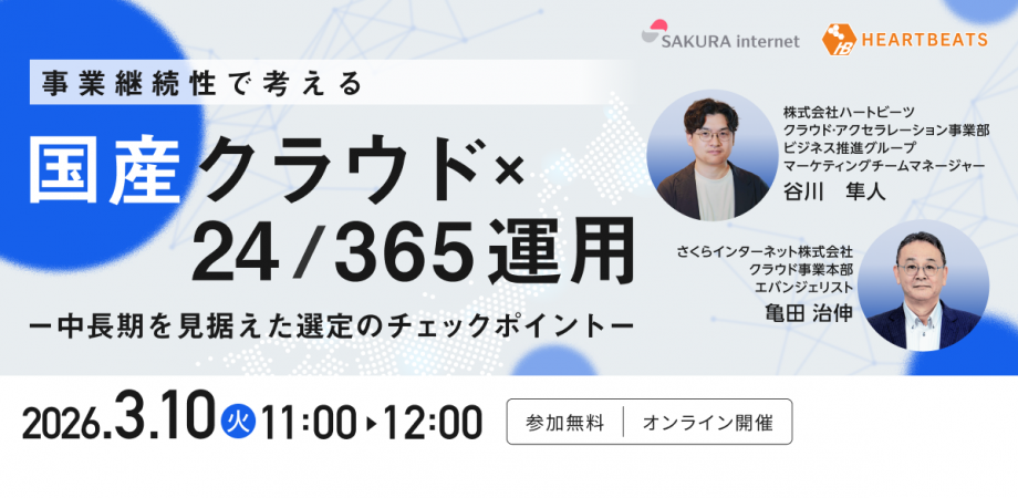 ◾︎日時【ライブ配信】:2026年3月10日(火)11:00~12:00◾︎概要⚫︎セッション Part.1|さくらインターネット株式会社「システムを止めない さくらのクラウドの今」⚫︎セッション Part.2|株式会社ハートビーツ「24時間365日“止めない”ためのクラウド運用と内製・外注の判断基準」