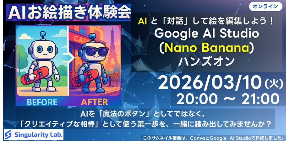 AIに「ロボットを描いて」と指示を与えて絵を描き、「そのロボットにサングラスをかけて」とAIと対話し 、「そのロボットをパリのカフェに連れて行って」と指示する...といった、AIが「文脈」や「直前の画像」を記憶しながら画像を更新して、自由に絵を描ける体験を皆さんにしていただきます。プログラミングの知識は一切不要です。AIを「魔法のボタン」としてではなく、「クリエイティブな相棒」として使う第一歩を、一緒に踏み出してみませんか?