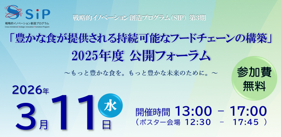 SIP3「豊かな食」プロジェクトでは、食料安全保障を支える「持続的に”豊かな食”が提供される国産資源を活用したフードチェーン」の再構築を目指した研究開発を進めています。本フォーラムでは、課題担当者がプロジェクトの進捗・成果及び社会実装への展望を講演し、「豊かな食」の実現に向けて有識者が議論するパネルディスカッションも実施します。また、同時間帯にポスター展示を行い、研究担当者がポスターやデモを用いた技術紹介を行い、来場者との連携やビジネスに向けた意見交換の場を設けます。