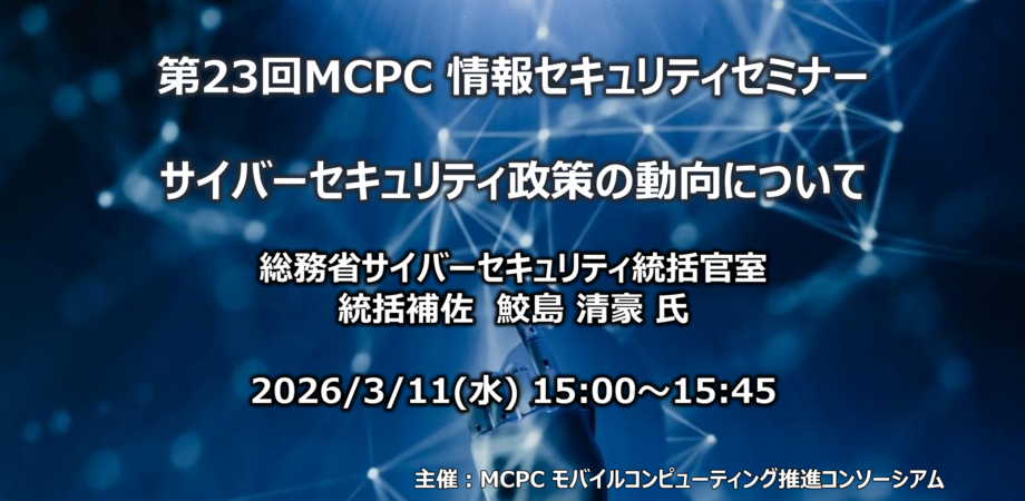 イベント詳細 モバイルコンピューティング推進コンソーシアム(MCPC)では、モバイルデバイスおよびIoT分野に関わる皆様を対象に、情報セキュリティに関する最新動向を学ぶセミナーを開催いたします。2026年3月11日(水)は、総務省 サイバーセキュリティ統括官室 統括補佐 鮫島 清豪 氏をお招きし、政府におけるサイバーセキュリティ政策の最新動向についてご講演いただきます。