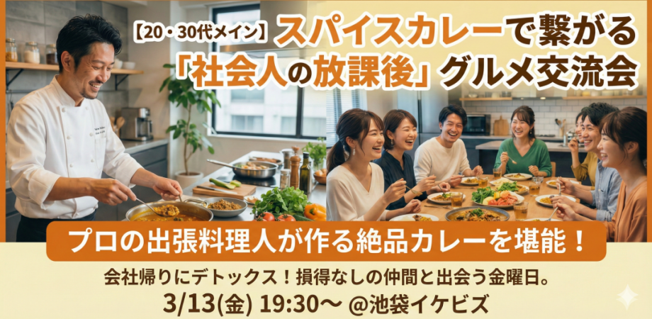 20・30代を中心とした社会人の方(それ以外の世代も参加OK!)職場以外の「ゆるい繋がり」が欲しい方料理人が作る本格スパイス&発酵カレーを食べたい方地方から上京してきて、東京に遊び友達が少ない方金曜の夜を充実させて、リフレッシュしたい方