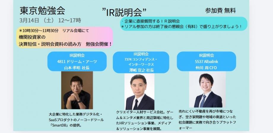 東京勉強会の3月14日申込みページです。 同日10時30分からは 機関投資家の決算短信・説明会資料の読み方 勉強会”東京勉強会Basic”を開催します。 午... powered by Peatix : More than a ticket.