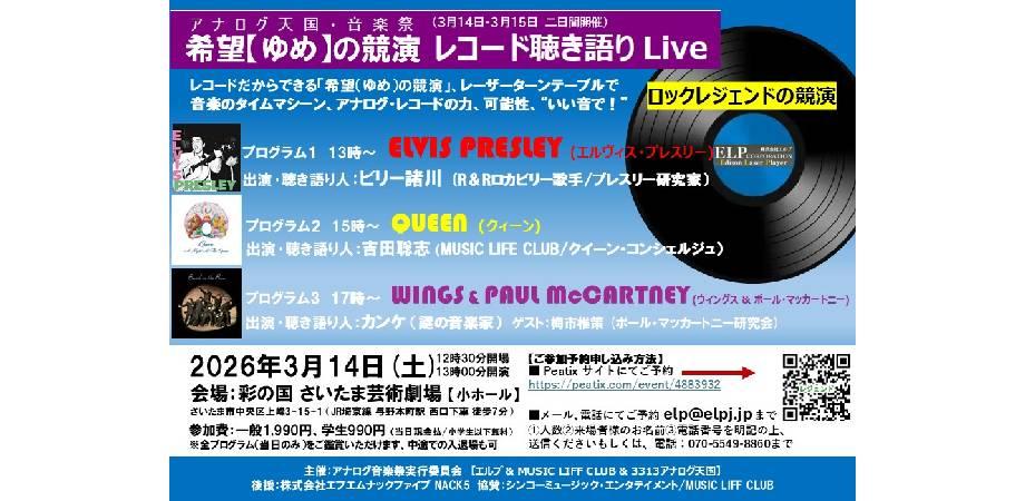 アナログレコードに刻まれたロックレジェンド、エルヴィス・プレスリー、クイーン、ポール・マッカトニー&ウィングスの記録が、レーザーターンテーブルとさいたま芸術劇場の音響設備により、あたかも当時のコンサート会場、レコーディングの現場にいるかのように再現。