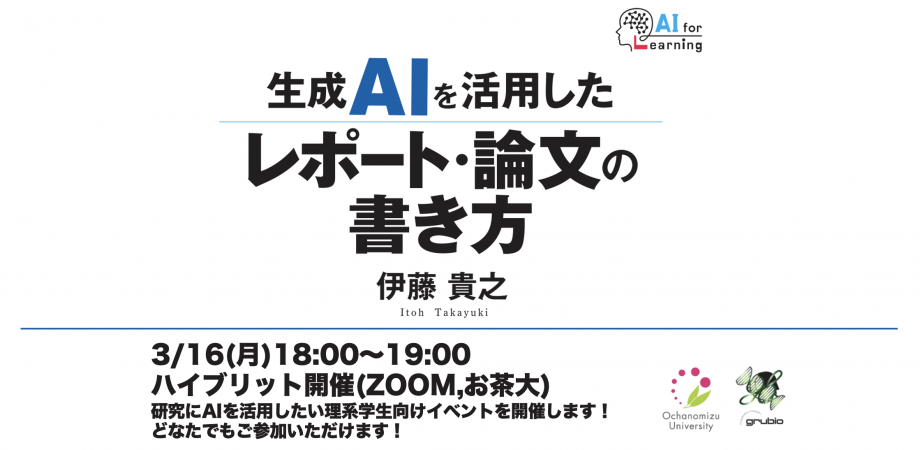 18:00 - 18:10 オープニング & grubio community紹介18:10 - 18:25 【講演】書籍『生成AIを活用したレポート・論文の書き方』解説と理系学生のためのAI活用/伊藤貴之先生18:25 - 18:45 【クロストーク & Q&A】事前に頂いた質問や、書籍の特定ページに関する疑問に答えます。対面会場からの飛び入り質問も歓迎します...