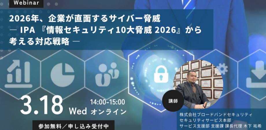 本ウェビナーでは、IPA『情報セキュリティ10大脅威 2026』(組織編)の全項目を俯瞰しながら、現在の攻撃トレンドと被害傾向を整理し、企業として取るべき対応戦略の方向性を解説します。