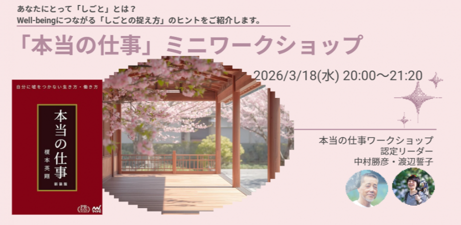 イベント詳細 ◇はじめにいわゆる「おとな」になると 「仕事」で苦労する人、 自分を小さくしてしまったりする人、 いつの間にか自分ではない自分になろうとしてしまう人 本当に多いと思うし自分もそうでした。このワークショップで、少し「しごと」について、改めて見つめなおしてみませんか?そんな「おとなたち」を見て 仕事をするの怖いな、嫌だな・・・と思っている、これから「しごと」をする人たちへ。このワークショップで、「しごと」の捉え方、こんな風にできるんだ!そんな思い直す体験もしてみませんか?◇本当の仕事ワークショップとは「本当の仕事ワークショップ」は榎本英剛さん(★1)が開発し30年継続した「天職創造セミナー」がベースです。現在では、認定リーダーが「本当の仕事ワークショップ」という名前で提供をしています。日本以外でも、中国・韓国・香港・台湾にもこのムーブメントは広がっており、認定リーダーは全世界で200名ほど。くわしくはこちらから。