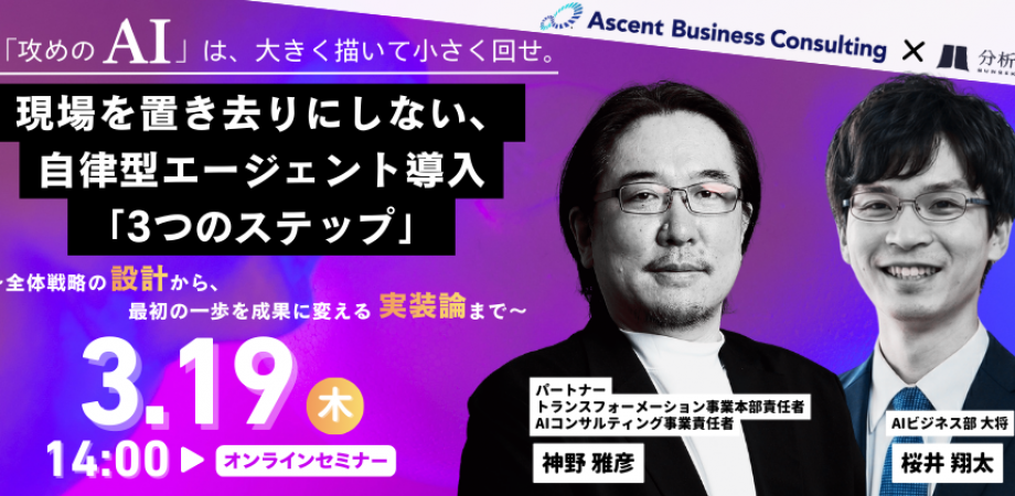 イベント詳細 ━★AI/DX活用セミナーのご案内★━━━━〈タイトル〉「攻めのAI」は、大きく描いて小さく回せ。 現場を置き去りにしない、自律型エージェント導入「3つのステップ」 ~全体戦略の設計から、最初の一歩を成果に変える実装論まで~