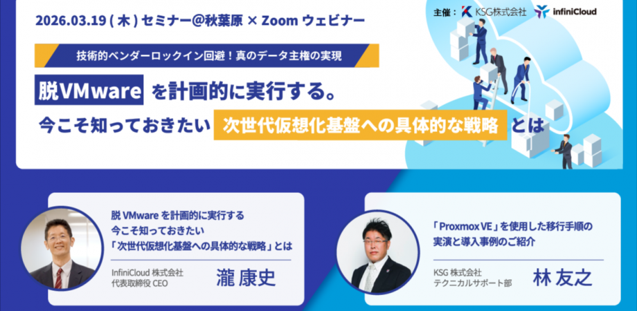 日時 :2026年3月19日(木)15:30~17:30 ※受付開始15:00主催 :InfiniCloud株式会社、KSG株式会社 ※KSG株式会社は弊社サービス、プロダクトのプラチナ・販売パートナーです。登壇者:InfiniCloud株式会社 代表取締役CEO 瀧 康史、KSG株式会社 林 友之会場 : ・会場:東京都千代田区神...