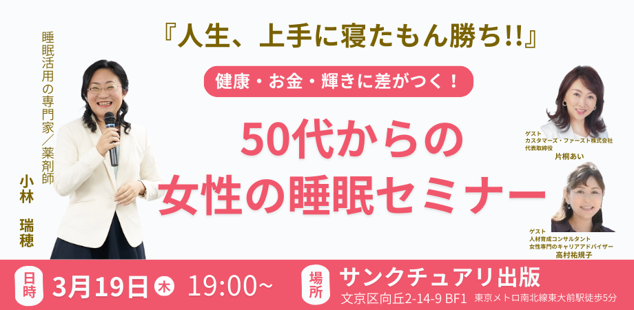 そんなあなたの不安を少しでも解消するために、そして、私らしく元気で楽しく豊かに死ぬまで活きぬく心と体でいるために、「知っておくと人生に差がつく50代からの女性の睡眠」についてお届けします。