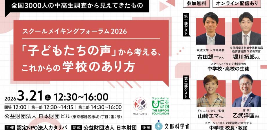 当日は、現地(日本財団ビル)とオンラインのハイブリッドで開催します。「これからの学校のあり方」について、一緒に考えていきましょう。当日のご参加が難しい方も、後日アーカイブ動画で全編をご視聴いただけますので、ぜひお申込みください。【詳細はこちら】https://rulemaking.jp/news/4817/【申込はこちら】https://forms.gle/nNTLBD2U9Xq7X8TX7【イベント概要】■イベント名:スクールメイキングフォーラム2026 「子どもたちの声」から考える、これからの学校のあり方■日時:2026年3月21日(土) 12:30〜16:00タイムスケジュール:【第一部】12:30〜14:15(12:00開場) 14:15~14:30(休憩)【第二部】14:30〜16:00■登壇者と内容:【第一部】テーマ:「子どもたちの声」から考える、これからの学校のあり方登壇者:堀川 拓郎氏(文部科学省初等中等教育局 教育課程課 学校教育官)、古田 雄一氏(筑波大学人間系助教)、スクールメイキング実践校 泉大津市立小津中学校 生徒、愛媛県立丹原高等学校 生徒...