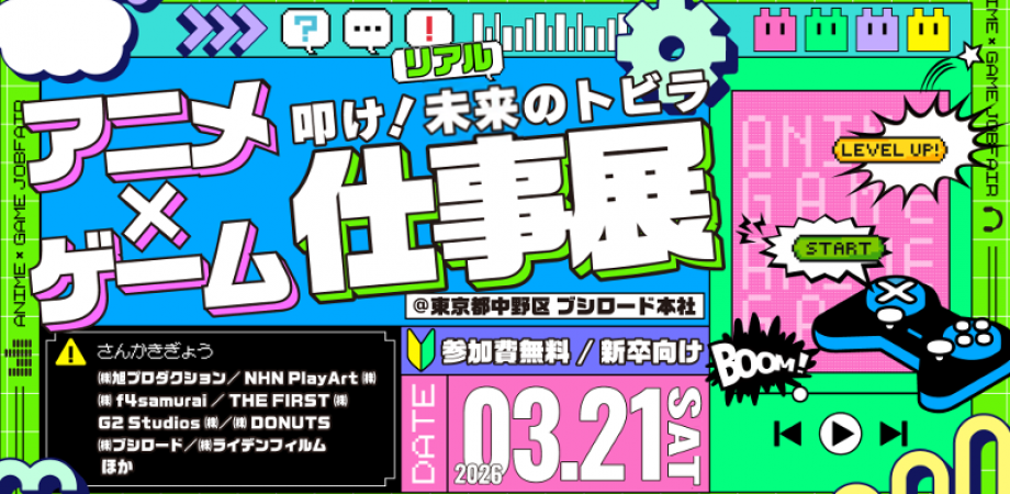 イベント詳細 株式会社ブシロード(本社:東京都中野区、代表取締役社長:木谷高明)のグループ会社にあたる株式会社gamebiz(本社:東京都中野区、代表取締役社⻑:大貫佑介)は、2026年3月21日(土)にエンターテイメント業界への就職を志す学生を対象とした就活イベント『アニメ・ゲーム仕事展』を開催いたします。本イベントは、アニメ・ゲーム業界で活躍する企業の現場担当者・人事担当者と直接話すことができ、各社の仕事内容や業界全体の仕事構造を“等身大”で理解できる企業研究・就職活動向けイベントです。■『アニメ・ゲーム仕事展』とは『アニメ・ゲーム仕事展』は、株式会社ブシロードのグループ会社であり、ゲーム・エンタメ業界専門ニュースメディア「gamebiz(ゲームビズ)」を運営する株式会社gamebizが主催する、アニメ・ゲーム業界に特化した仕事理解型の就活イベントです。