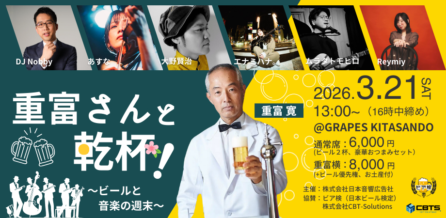 北参道GRAPESにて2026年3月21日(土)開催!「重富さんと乾杯!〜ビールと音楽の週末〜」 注ぎ方でビールの味が変わる?感動のサッポロ生ビール黒ラベルが味わえる!ビール注ぎの名手、重富寛氏を迎えて開催する音楽ライブイベント今回も重富さんがサーブするのはサッポロ生ビール黒ラベル。