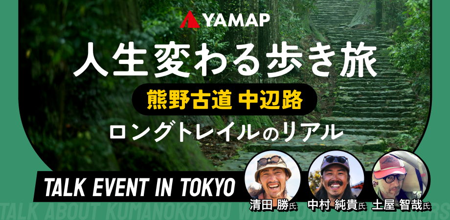 本イベントでは、昨年11月に7泊8日で「中辺路」のハイク取材を行った取材班たちを招き、「YAMAP MAGAZINE」記事企画の「番外編」として、その魅力を余すことなく語っていただきます。取材の道中に生まれた高い熱量をそのままお伝えし、新しい挑戦の一歩を踏み出そうとするハイカーたちの背中を後押しします。また、トークセッション後には登壇者との「歩き方相談会」も開催。