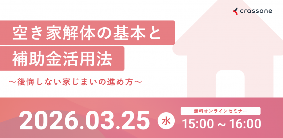 16万件以上の家じまいや解体工事に関する相談に携わったクラッソーネから、『空き家問題の現状』『解体工事の進め方』『実例から見る解体工事に必要なお金の話』『解体工事会社の選び方』『補助金活用法』についてプロの視点で解説します。