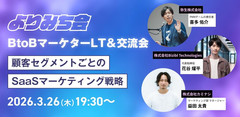 今回は弥生株式会社、株式会社Bizibl Technologies、株式会社カミナシの3社に登壇いただき、「顧客セグメントごとのSaaSマーケティング戦略」についてお話いただきます。ホリゾンタルSaaS、バーティカルSaaSなど様々な事業モデルにおける、顧客セグメントの設計や施策などの事例を学べる会です。新しい視点や具体的なヒントを得られる場となれば幸いです。