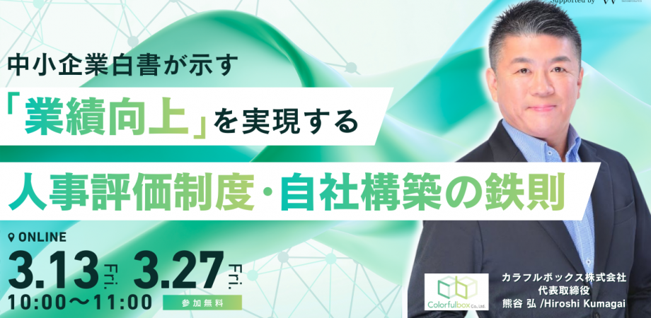 高額なコンサルに頼らず、形骸化しない人事評価制度を自社で構築・運用する方法を解説します。◇こんなお悩みありませんか?・外部に丸投げした評価制度が、結局使われなくなった・高額なコンサル費用を払ったが、自社に合わなかった・制度はあるが、評価が業績につながっていない・1つでも当てはまる方は、本セミナーがお役に立てます。◇このセミナーで分かること・なぜ人事評価制度は「自社で作る」必要があるのか・制度を形骸化させず、運用を止めないための考え方・最短1ヶ月で評価制度を完成させる具体的な進め方 ◇セミナープログラム▶第1部なぜ人事評価制度は「自社で作らなければならない」のか