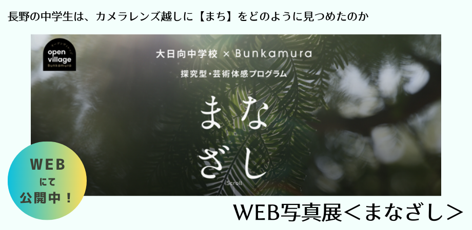 https://www.bunkamura.co.jp/sp/openvillage/lp/oohinatajhs/?waad=rLoaPdoy&ugad=rLoaPdoy\WEB写真展開催にあたり、表現のプロフェッショナルが終結!/WEB写真展<まなざし>の制作関係者である、写真家のかくたみほ氏、アートディレクターの柿木原政広氏と大日向中学校教頭の関康平氏がオンライン上に集まり、制作過程での気づきや面白かったエピソードを語った座談会レポートも公開中です。子どもたちの学びの様子や大人たちの気づきを知ることができます。写真と“まち”に真正面から向き合った、子どもたちと大人たちの集大成をどうぞお楽しみください!WEB写真展<まなざし>の制作秘話を語る〈前編〉WEB写真展<まなざし>の制作秘話を語る〈後編〉★探究型・芸術体感プログラムに関して興味・関心がある先生方は、こちらよりお気軽にご連絡ください。https://ssl.bunkamura.co.jp/forms/inquiry/・・・ ・・・ ・・・ ・・・ ・・・ ・・・◆Bunkamuraオープンヴィレッジとは文化との新たな出会いが見つかる「学び」と「体験」の場。複合文化施設Bunkamuraを飛び出し、渋谷をはじめ、さまざまな地域や場所で文化・芸術のすそ野を広げる新たな文化情報発信とアウトリーチ活動を展開します。・・・ ...