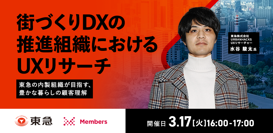 本セミナーでは、東急株式会社のDX内製開発組織「URBAN HACKS」の1人目UXリサーチャーとして活動する水谷 駿太 氏が登壇します。象徴的な大規模再開発だけでなく、鉄道領域をはじめとする「沿線でのローカルな日常」をより豊かにするために、デジタルを通じてどう顧客を理解し、サービス改善に繋げているのか。内製組織だからこそ見えてきた、現場の実践知と試行錯誤のプロセスを共有いただきます。