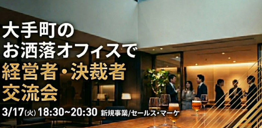 当日の流れ18:15 会場オープン/フリートーク18:30 乾杯・交流開始20:15 締め20:30 完全終了 こんな方におすすめ・経営者/役員/事業責任者/部長以上など、意思決定に関わる方・新規事業・事業開発・アライアンスを推進している方・協業先・外部パートナーを探している方・事業のアイデアを壁打ちし、前に進めたい方・大手町周辺で“質の高い出会い”を作りたい方 交流テーマ(例)当日は以下のようなテーマを自由に話せる場にします