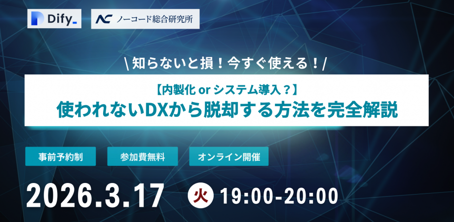 ✅ 現場DXを進めたいが、システム導入か内製化かの判断が曖昧で意思決定が止まっている✅ 現場単位で内製化してDXを進めたいが、どの業務から着手すべきか整理できていない✅ ノーコード含め選択肢が増える中で、内製化ツールの選定基準が社内で合意できていない✅ 既にDXに取り組んだが、現場で使われず成果が見えないまま形骸化した経験がある
