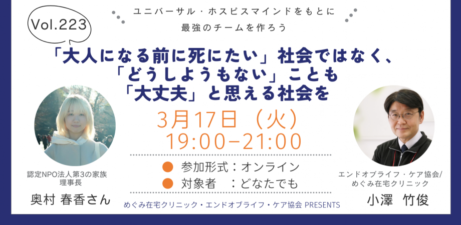 「大人になる前に死にたい」社会ではなく、「どうしようもない」ことも 「大丈夫」と思える社会を(第3の家族 奥村春香さん): 第223回 ユニバーサル・ホスピスマインドをもとに最強のチームを作ろう